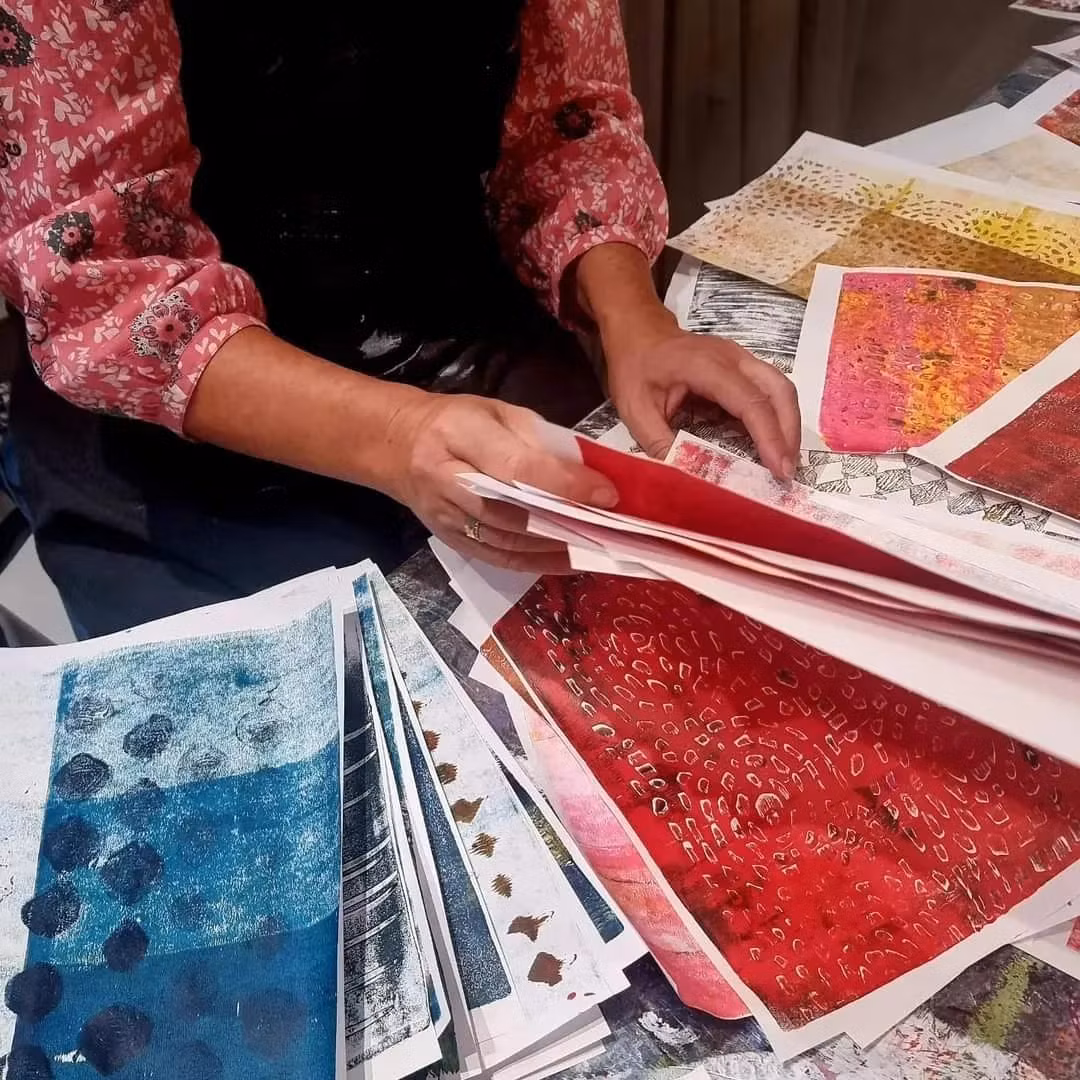 Under den här kursen tränar du på att skapa collage och du lär dig behärska tekniken att göra unika monoprints med gelliplate, akrylfärg och olika redskap. I ditt eget skapande kommer du att öva på sammansättning och uppbyggnad. En väl avvägd komposition framhäver och förstärker ditt uttryck. Vi kommer att träna mycket på det, varvat med handledning och inspirations-demo.