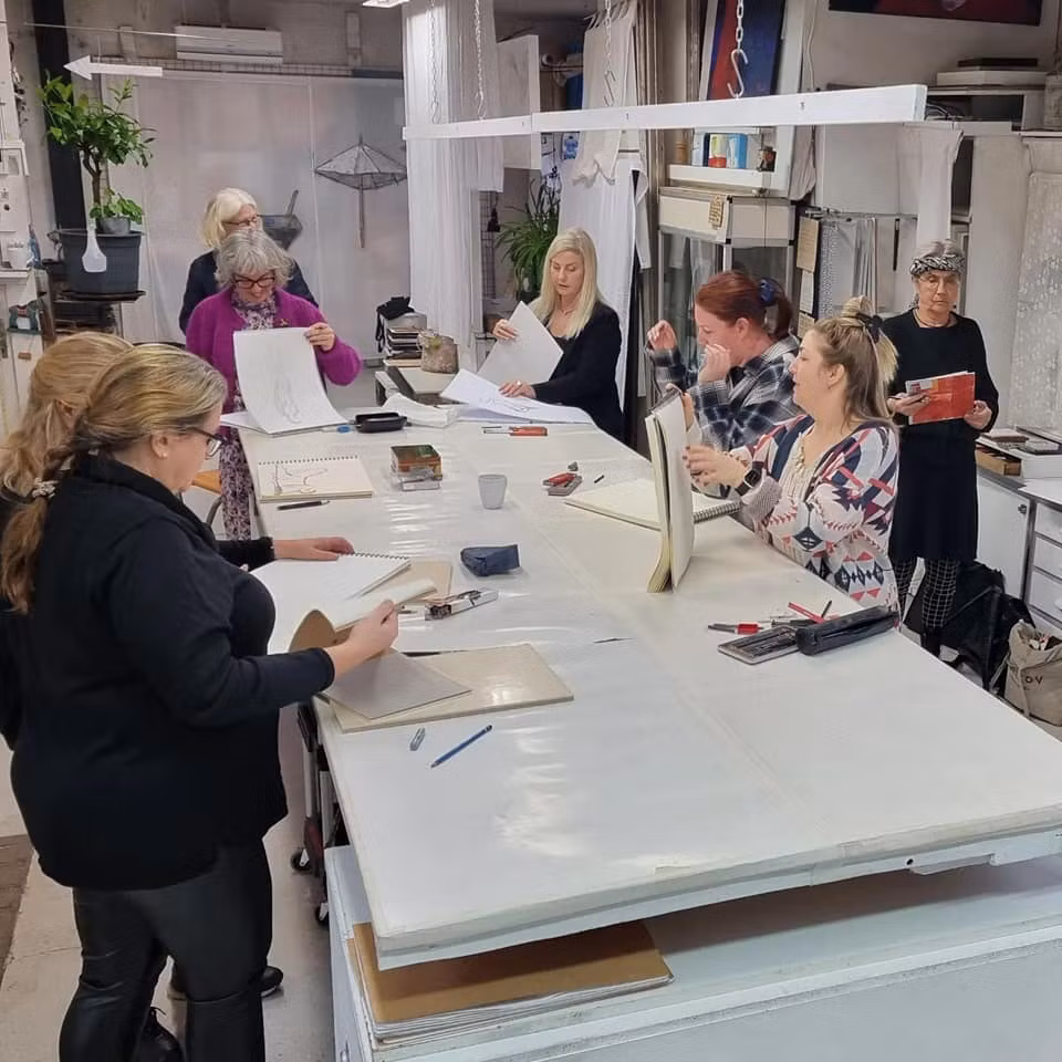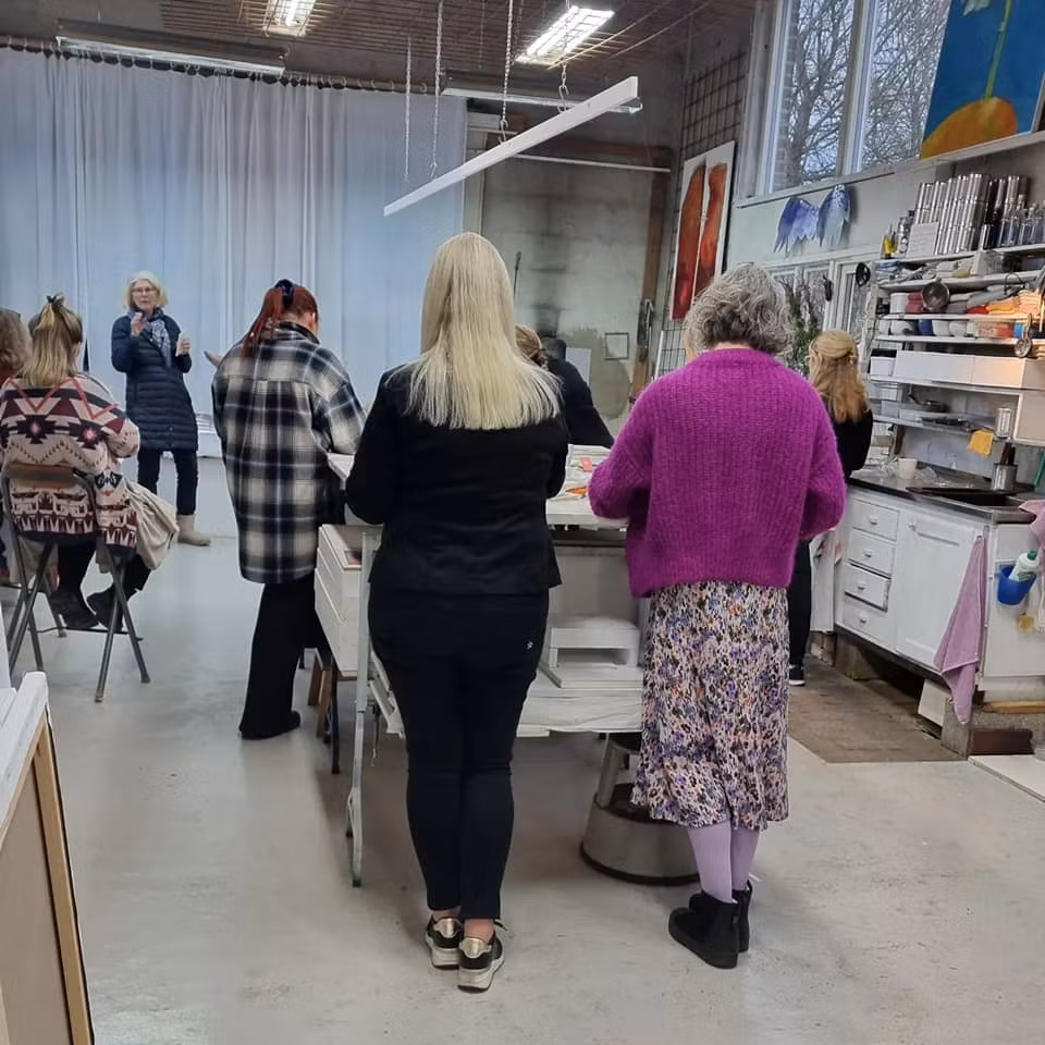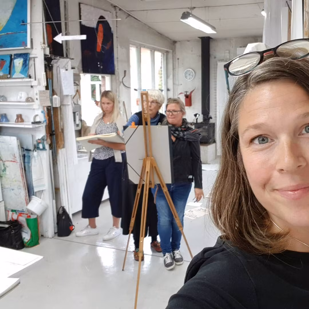 Till vår hjälp har vi också en professionell krokimodell och vi håller till i en kreativ och trivsam miljö i konstnär Inga Björstedts atelje.